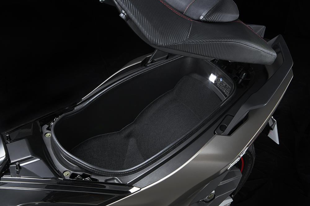 The capacious under seat storage compartment is capable of storing one full-face helmet and one open-face helmet*, striking the perfect balance between the need for large storage space for extended journeys, whilst being compact enough for spirited riding. There are also two glove compartments for storing smaller items